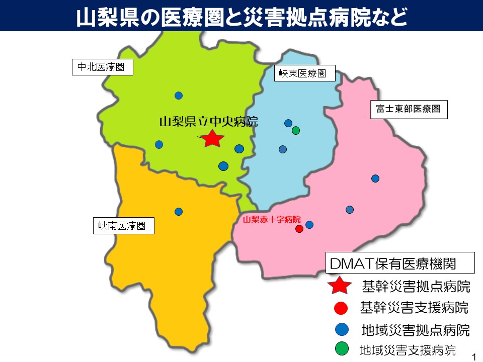 当院は山梨県唯一の基幹災害拠点病院であり、県内での災害発生時には被災地域からの傷病者の受入れの拠点となり、災害地へ災害時派遣医療チーム(Disaster Medical Assistance Team;DMAT)を派遣する体制を整えています。その他県内の災害対応の中心的役割を担っており、山梨県内の災害拠点病院の機能を強化するための訓練、研修の企画運営を県と協力しながら行っております。また、消防機関、警察とも合同で多数傷病者発生を想定した訓練も行っております。
