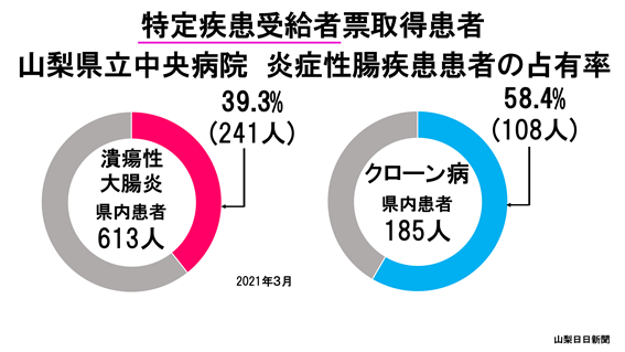 炎症性腸疾患は専門的な知識が必要であり、当院に腸疾患の患者さんが集まる傾向にあります。2021年3月の時点で当院に受診されている患者さんは、潰瘍性大腸炎では山梨県特定疾患認定患者の39.4%、クローン病では山梨県特定疾患認定患者の58.4%となります。