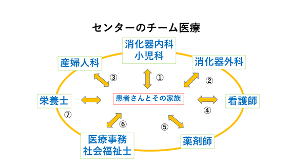 炎症性腸疾患はまずは内科で診療を行うことが多いですが、さまざまな業種が連携してひとりの患者さまに対応する必要があります。