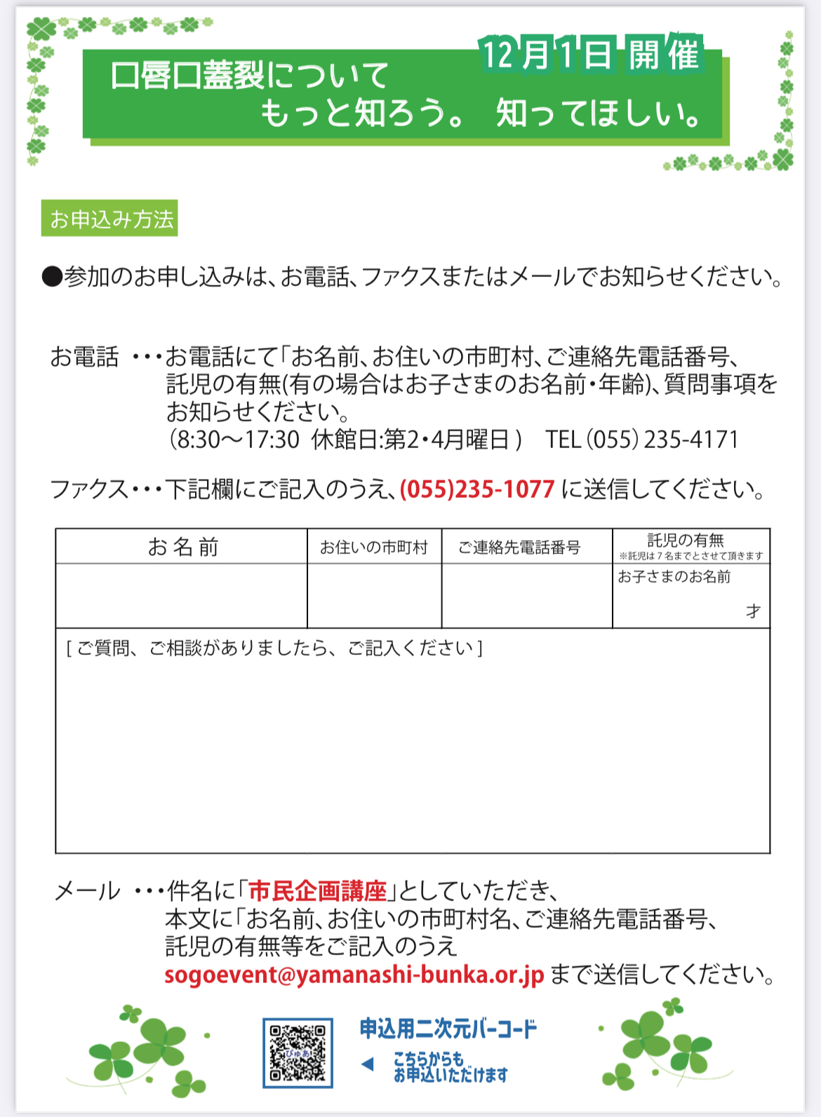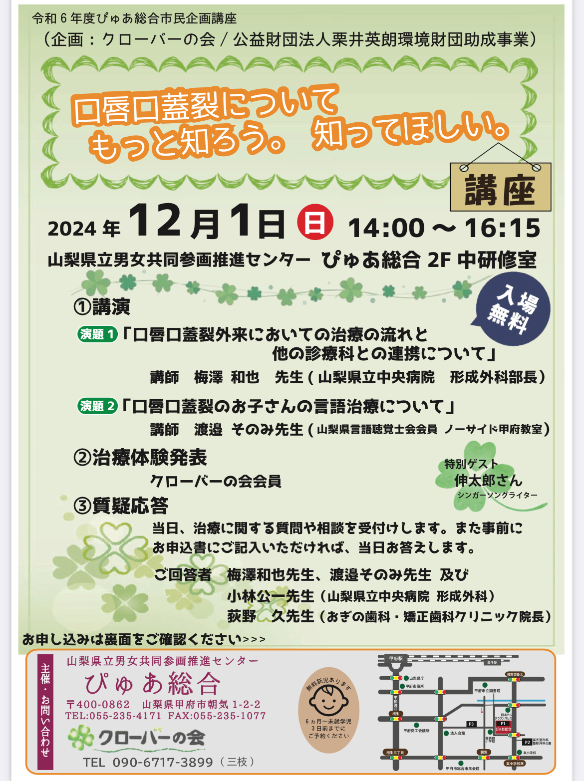 コロナ禍で中断されていた口唇口蓋裂の講演会が今年12月1日に開催されます。
