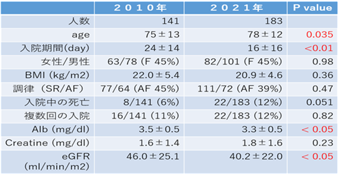 表3:当科へ入院した心不全患者の2010年と2021年の比較( 2023/3日本循環器学会総会にて発表)。心不全患者の高齢化、入院期間の短縮(病診連携の効果)、腎機能低下症例の増加が認められた。