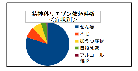 入院している方のだいたい30%くらいに、不眠、気分の落ち込み、不安、いらいら、興奮など何らかの精神症状を合併すると言われています。こんな時に、精神科に相談し、身体科と精神科のスタッフが協力して精神症状に対応する分野を「リエゾン精神医学」と言っています。