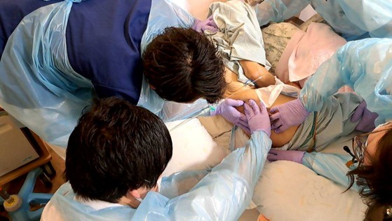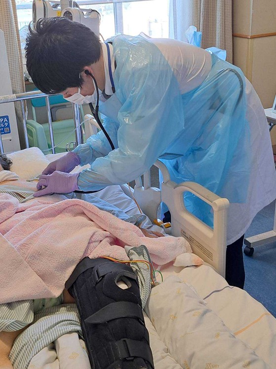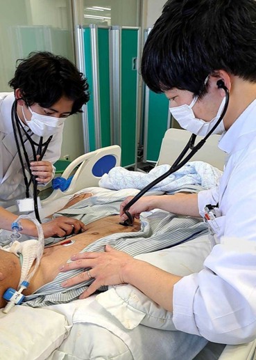 ベッドサイドで身体所見を確認し、治療評価につなげる場面 |
