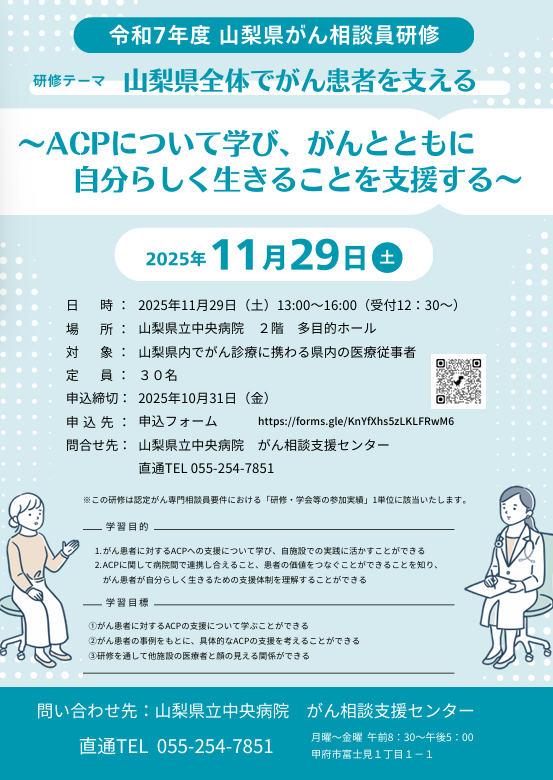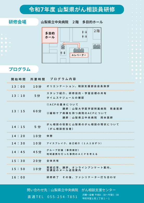問い合わせ先)山梨県立中央病院 がん相談支援センター 直通℡055(254)7851