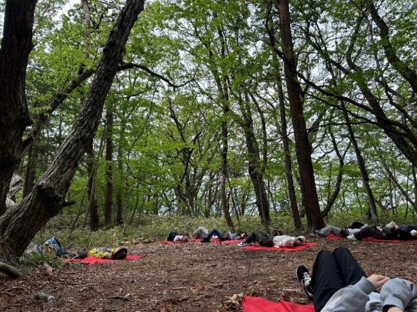 身体中で自然を感じる「森林療法」を行っている様子です。モニター音やNsコールなど機械音に囲まれた病院の環境から少し離れてリフレッシュすることも大切なのだと感じることができました。 |