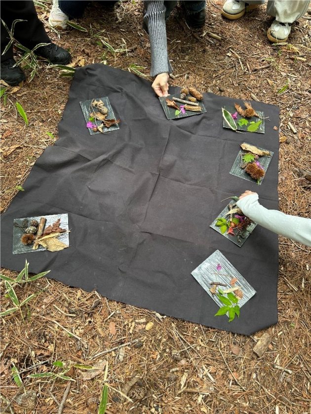 森林散策をする中で、色々な葉っぱや鳥の羽、木の枝など自然の中での“色”を集めて発表している様子です。