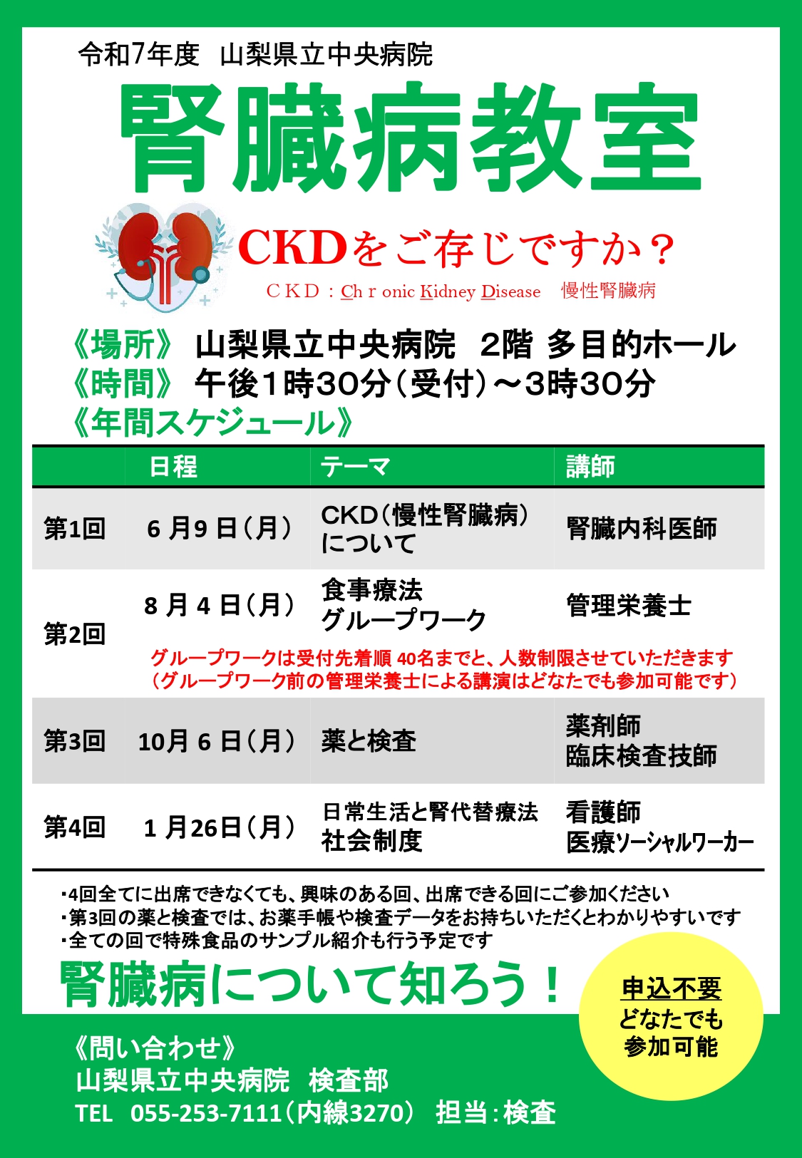 腎臓病の患者さんだけでなく、どなたでも参加いただける教室です。